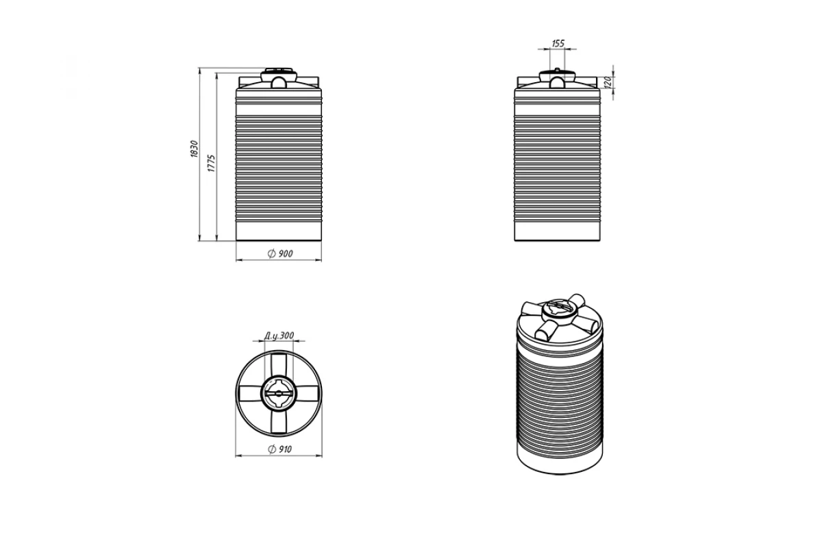Вертикальная цилиндрическая бочка серии ЭВЛ-Т объемом 1000 литров имеет компактные габариты и может быть размещена даже в условии дефицита свободной площади.