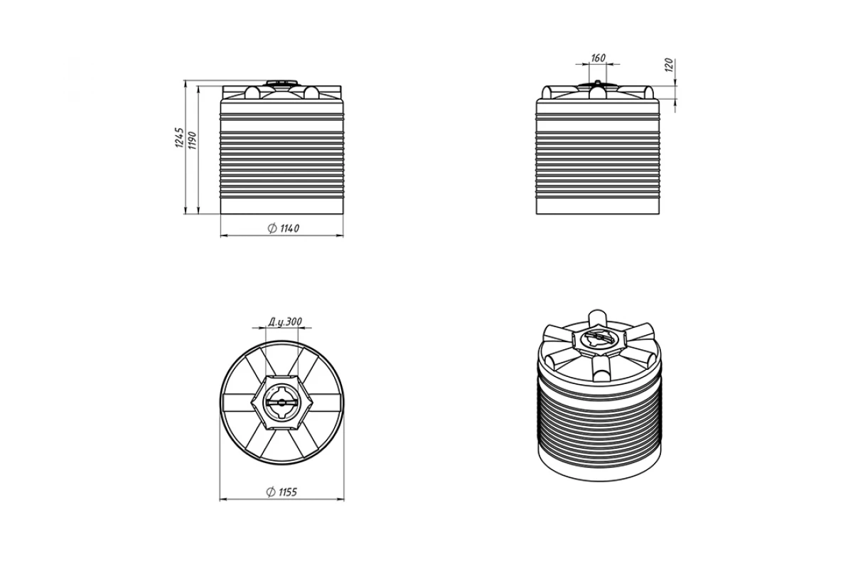 Вертикальная цилиндрическая бочка ЭВЛ 1000л имеет максимально устойчивую конструкцию и усилена специальными горизонтальными ребрами жесткости. Фактический объем ЭВЛ 1000л составляет не менее 1090 литров.