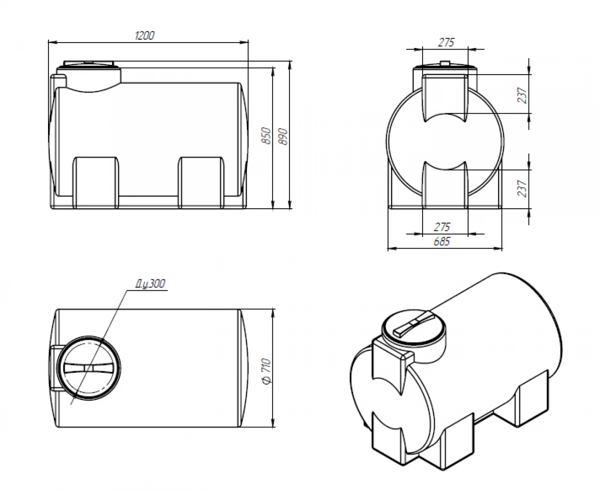 Горизонтальные емкости отличаются максимальной устойчивостью благодаря конфигурации с ножками.
