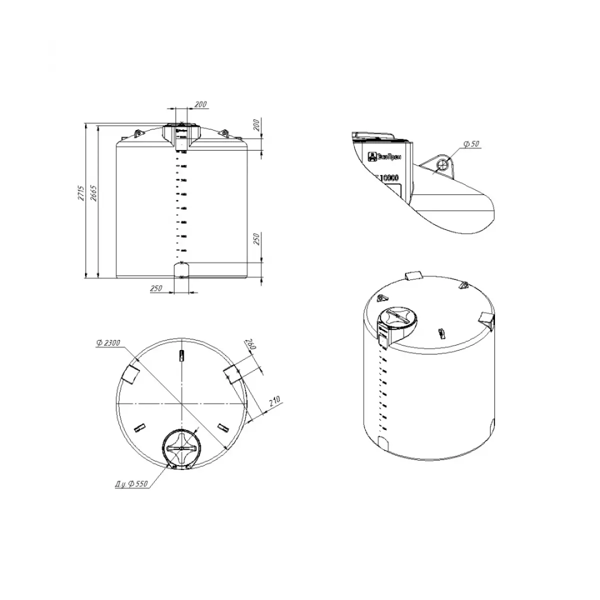 Диаметр горловины емкости составляет 535 мм, диаметр крышки 620мм.