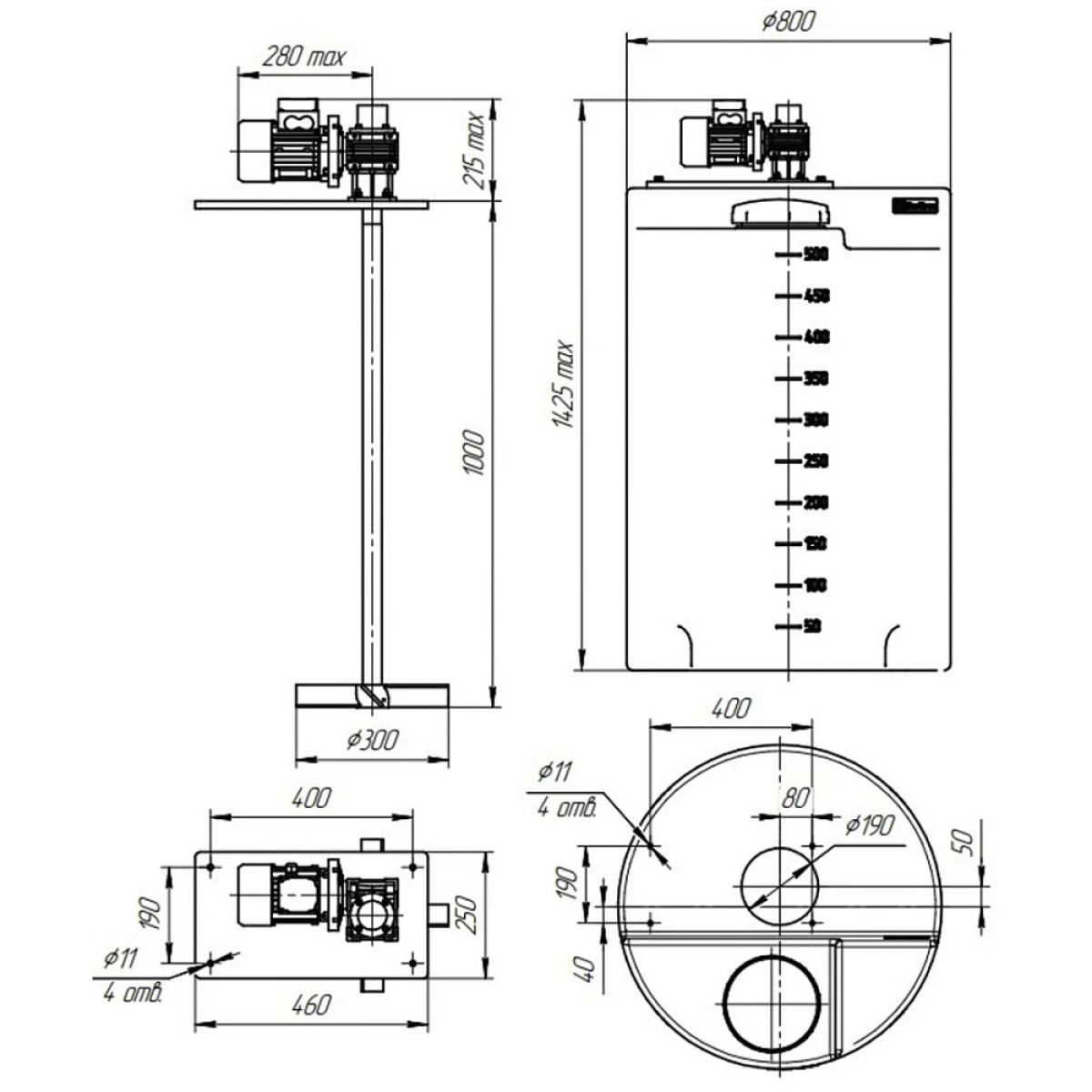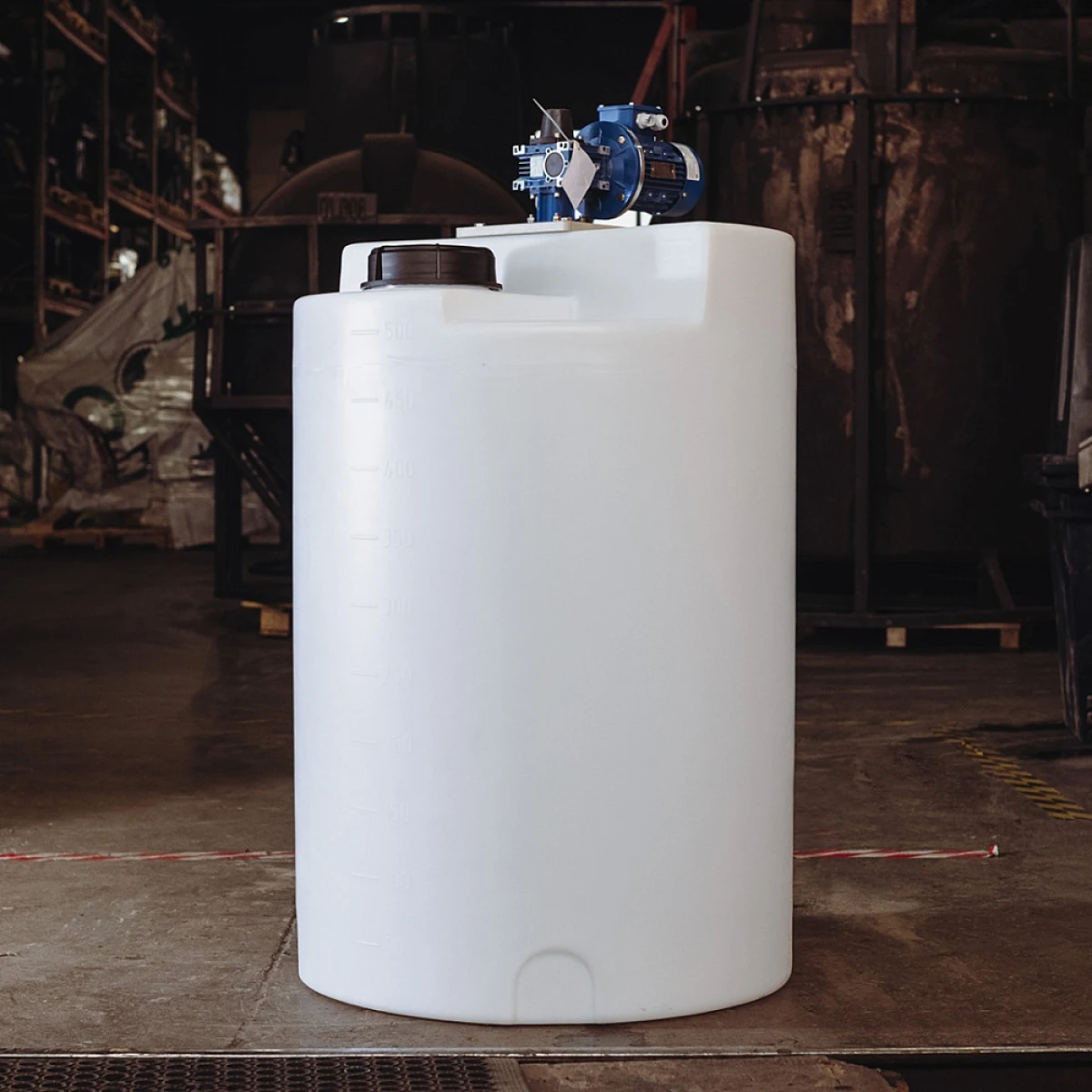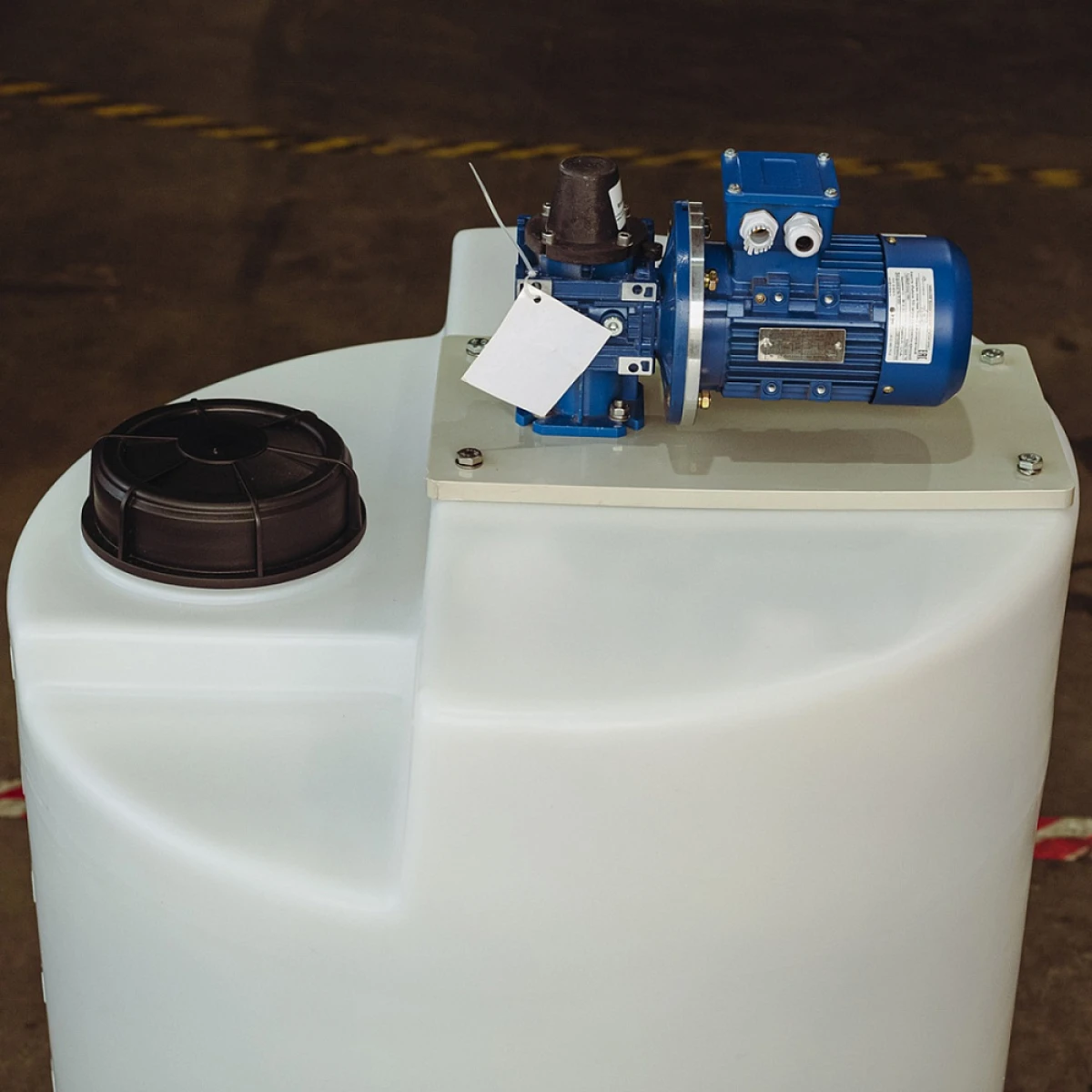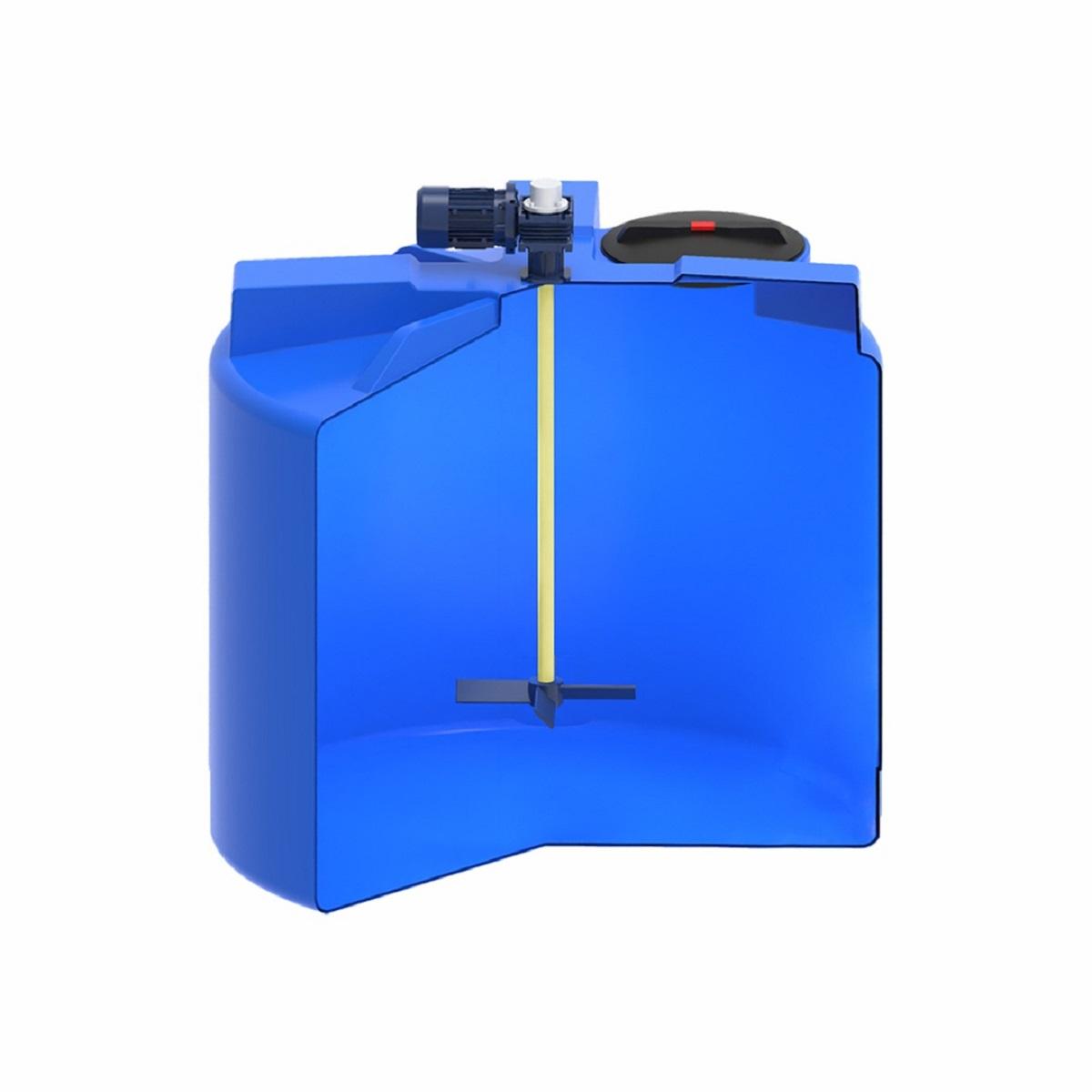 Мешалка специально подобрана для дозировочной емкости 500 литров с учетом габаритов и конструктивных особенностей емкости. Емкость поставляется с уже установленной мешалкой.