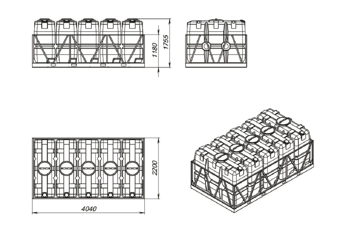 Кассета стандартная SK 2000 - 5 на 10 000 литров представляет собой пять емкостей общим объемом десять кубов. Емкости помещены в металлическую обрешетку, благодаря этому их транспортировка будет полностью безопасной. Все пять емкостей изготовлены из пластика, прочного и практичного материала с большим сроком эксплуатации. Каждая из емкостей снабжена крышкой с дыхательным клапаном, также на баки можно установить любую дополнительную арматуру, к примеру, отводы.