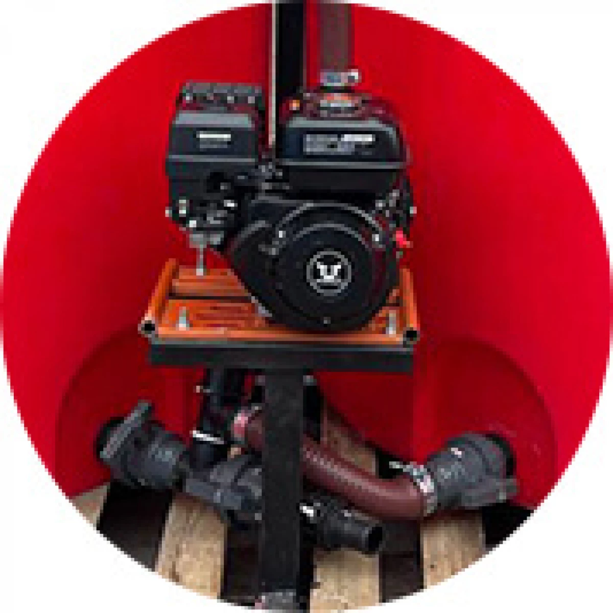 Установка состоит из бензиновой мотопомпы ZONGSHEN MG20 и комплекта запорной арматуры, фитингов и шлангов диаметром, фиксируемых силовыми хомутами, и монтируется на раме кассеты. Запорная арматура включает в себя шесть двухдюймовых шаровых кранов итальянского производства, в числе фитингов несколько тройников, отводов, угловых и резьбовых переходников.
