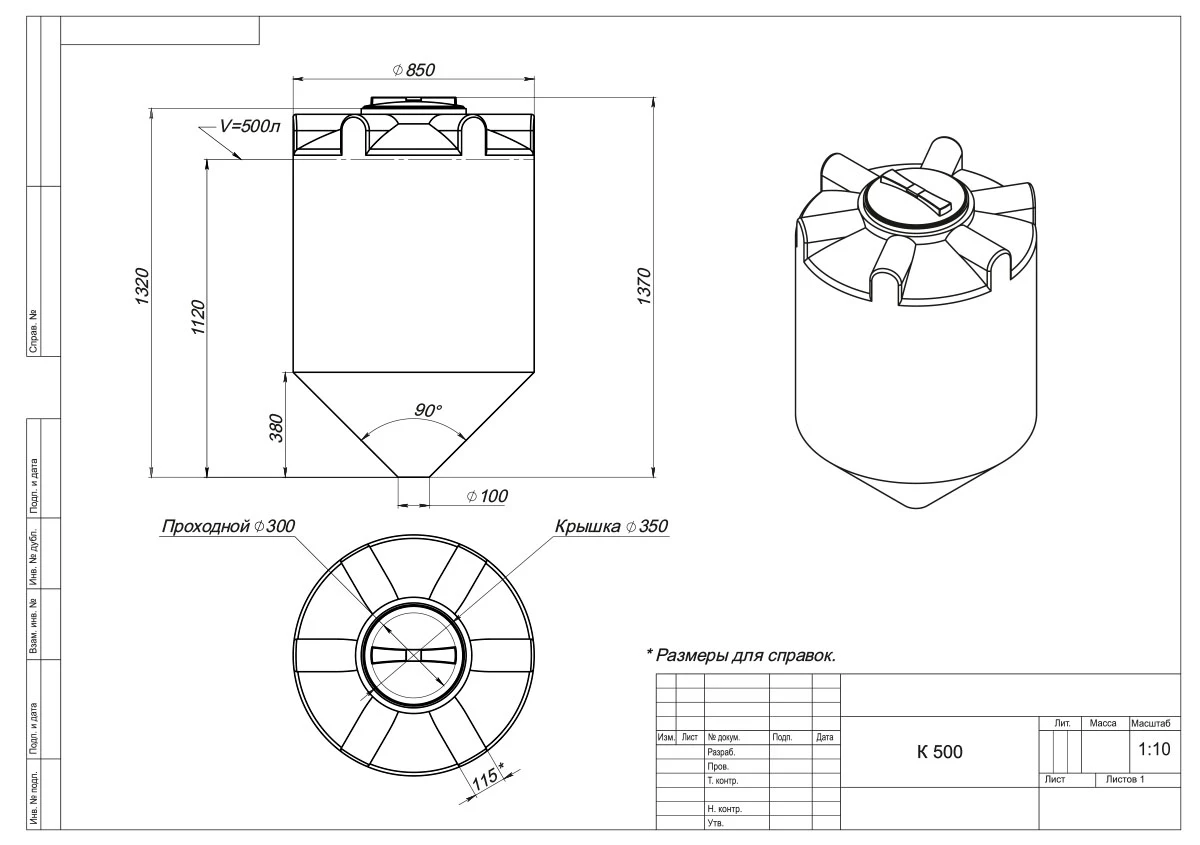 Емкость К объемом 500 литров – цилиндрический резервуар с конусным дном, обеспечивающим подачу и полный слив хранящихся в баке веществ.