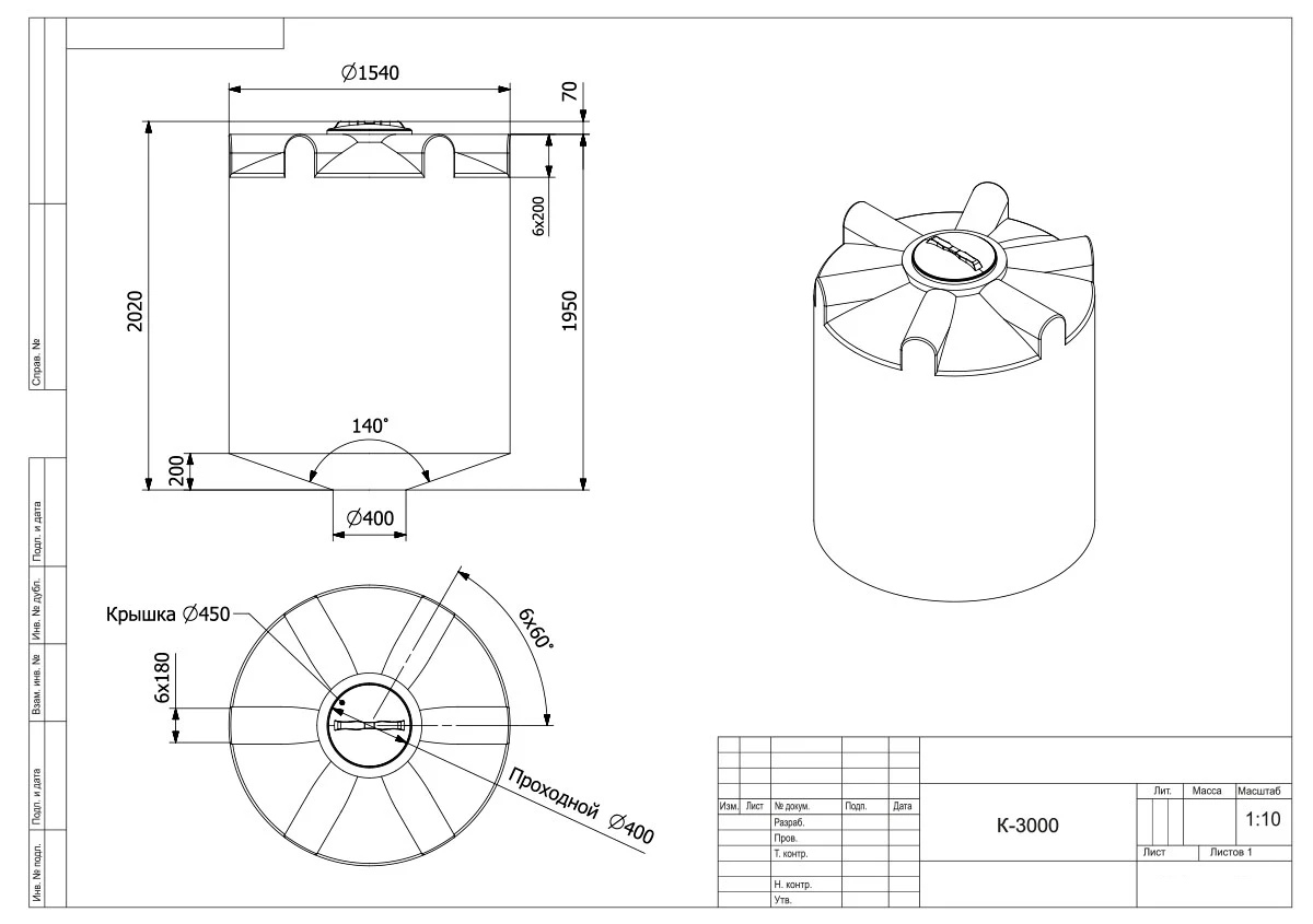 Емкость К объемом 3000 литров – цилиндрический резервуар с конусным дном, обеспечивающим подачу и полный слив хранящихся в баке веществ.
