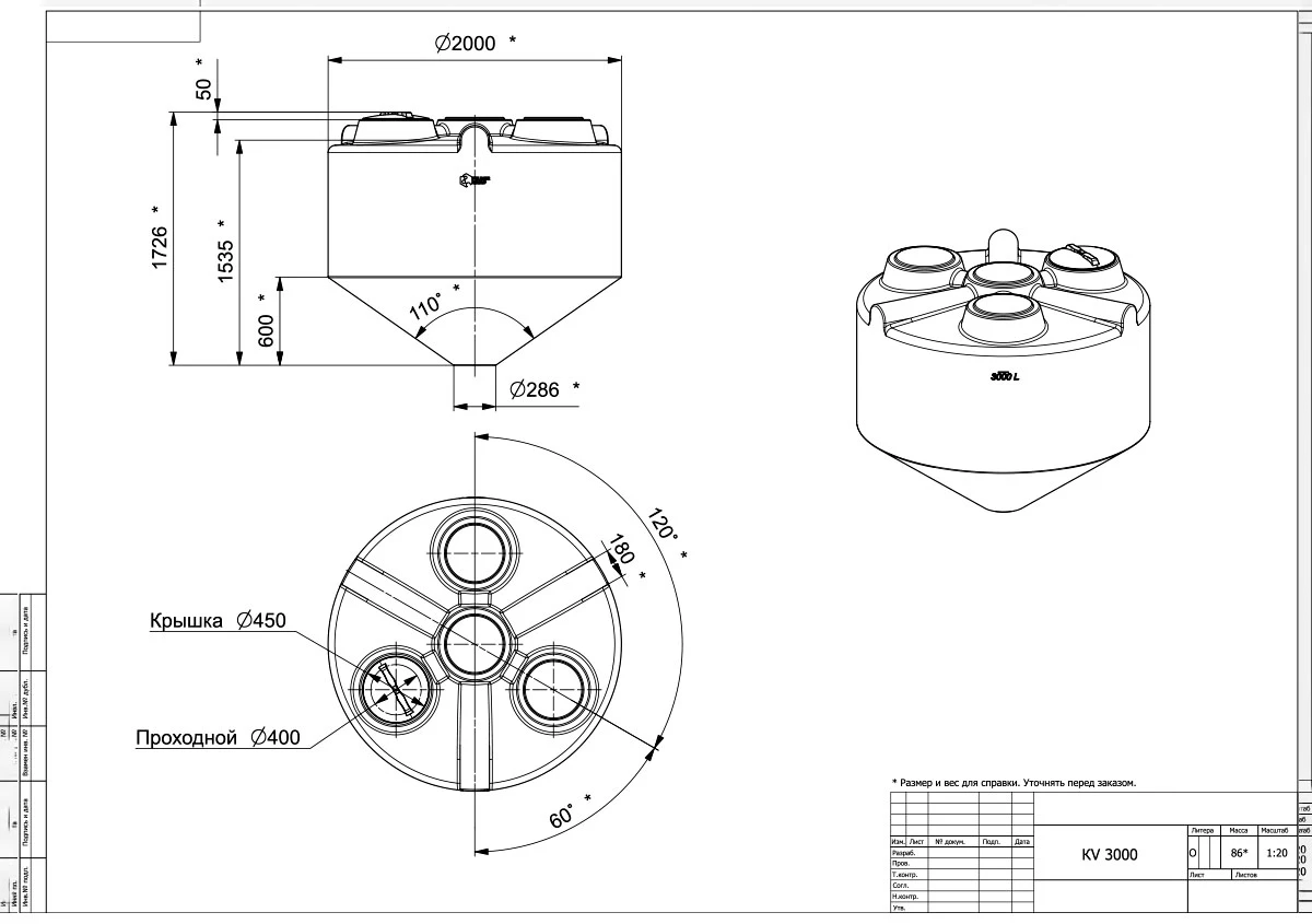 Емкость KV объемом 3000 литров – цилиндрический резервуар с конусным дном, обеспечивающим подачу и полный слив хранящихся в баке веществ.