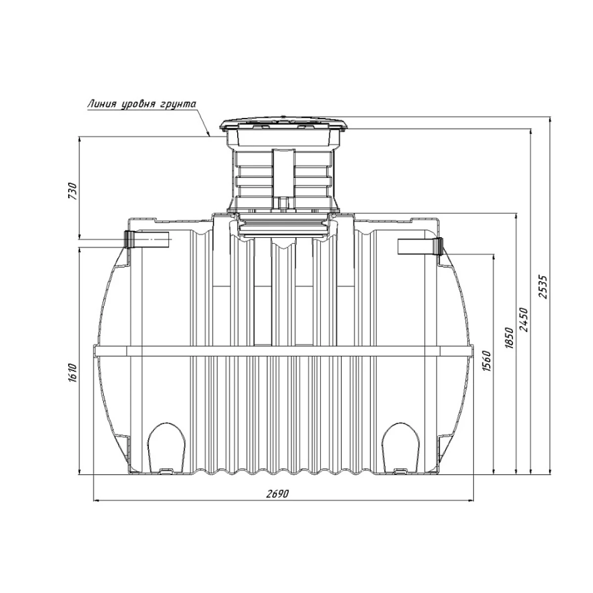 Там, где доступ человека не требуется (емкость используется как накопитель хозяйственно-бытовых стоков, технической и дождевой воды, питьевой поды и т.д.), подойдёт вариант с шахтой 160 мм. Высота шахты составляет 1000 мм. Шахту можно обрезать или нарастить в зависимости от глубины подводящей трубы.