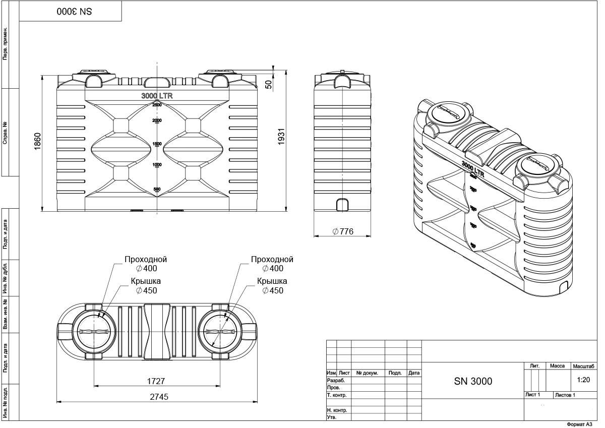Емкость SN 3000 – это прямоугольный пластиковый бак объемом 3000 литров, предназначенный для хранения питьевой воды, технических жидкостей, а также дизельного топлива.