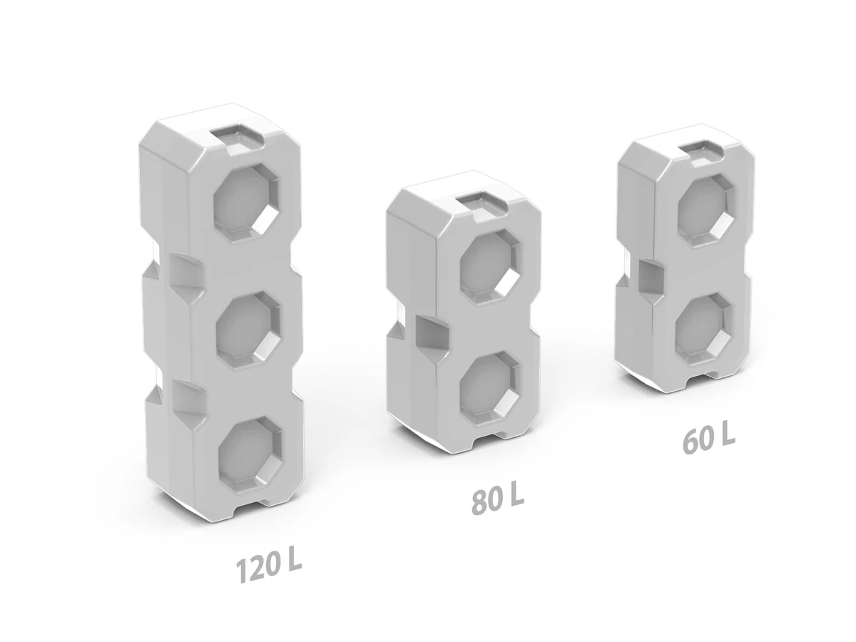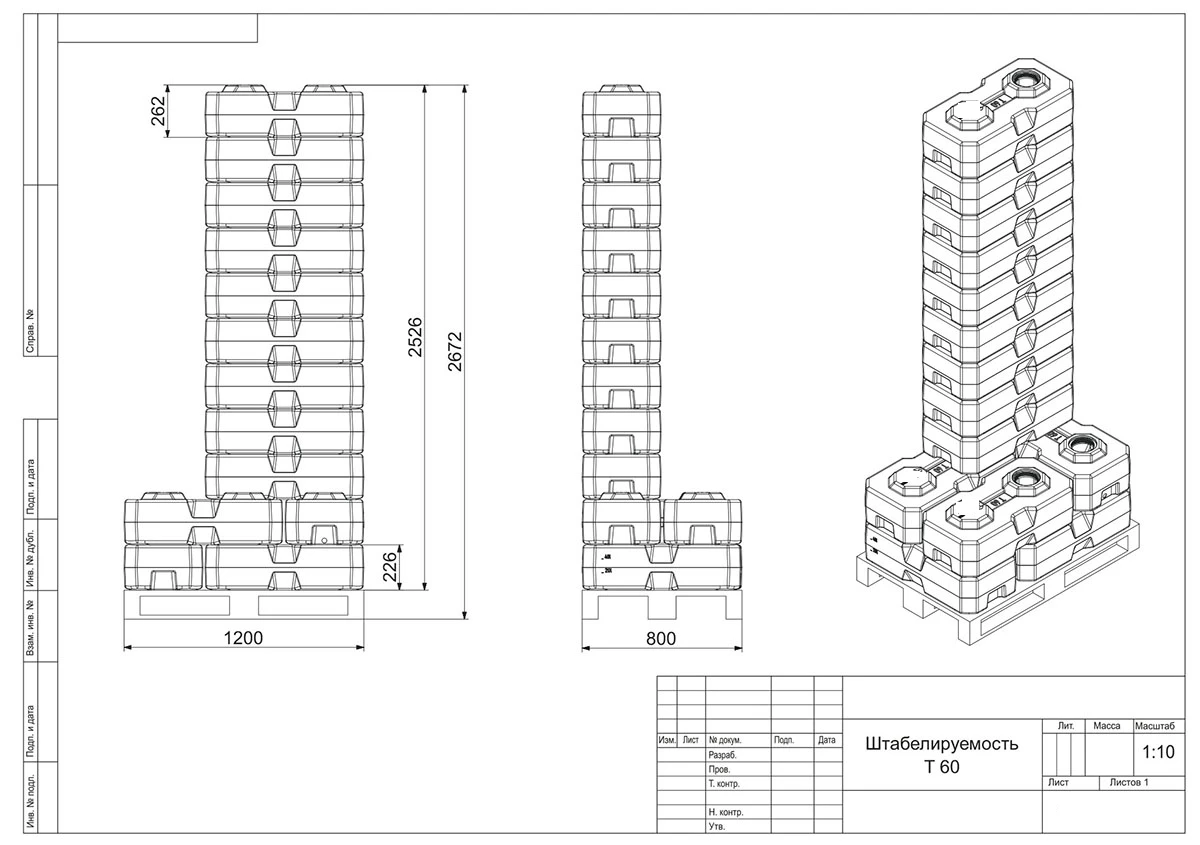 Плоская форма со специальными углублениями под установку крепления гарантирует безопасную транспортировку. А углубления в дне надежную штабелируемость при хранении в пустом виде. Для дополнительной прочности предусмотрены специальные ребра жесткости.