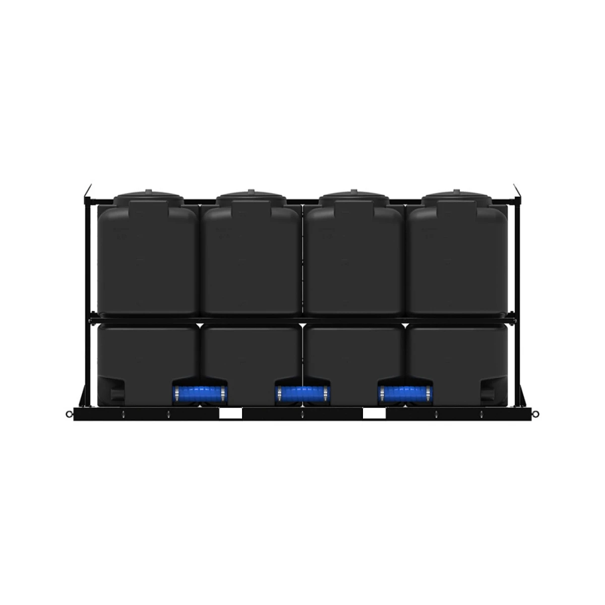 Кассета ST объемом 8 000л – готовое решение для транспортировки и хранения большого объема жидкости. Кассета укомплектована 4 емкостями ST объемом 2000л с 2 цельнолитыми патрубками диаметром 100мм*. Все емкости соединены между собой в сообщающийся сосуд при помощи шлангов и затянуты хомутами. Надежное соединение емкостей между собой гарантирует защиту от образования течи в период эксплуатации, а также длительный срок службы.