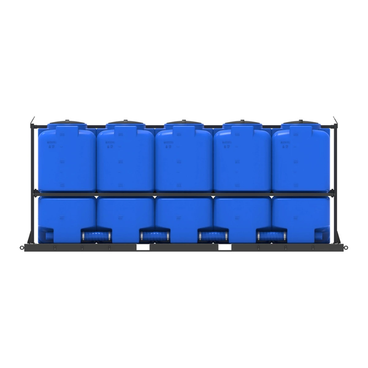 Кассета ST объемом 10 000л – готовое решение для транспортировки и хранения большого объема жидкости. Кассета укомплектована 5 емкостями ST объемом 2000л с 2 цельнолитыми патрубками диаметром 100мм*. Все емкости соединены между собой в сообщающийся сосуд при помощи шлангов и затянуты хомутами. Надежное соединение емкостей между собой гарантирует защиту от образования течи в период эксплуатации, а также длительный срок службы.