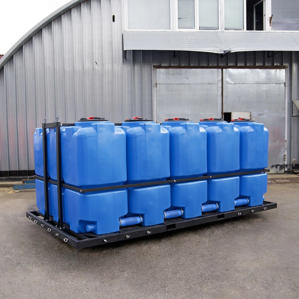 Конструкция обрешетки-кассеты надежно фиксируют емкости во время транспортировки, не позволяя смещаться в любую из плоскостей. Пол кассеты – цельнометаллический. Кассета имеет низкий центр тяжести благодаря малой высоте емкостей, что обеспечивает устойчивость автомобиля.