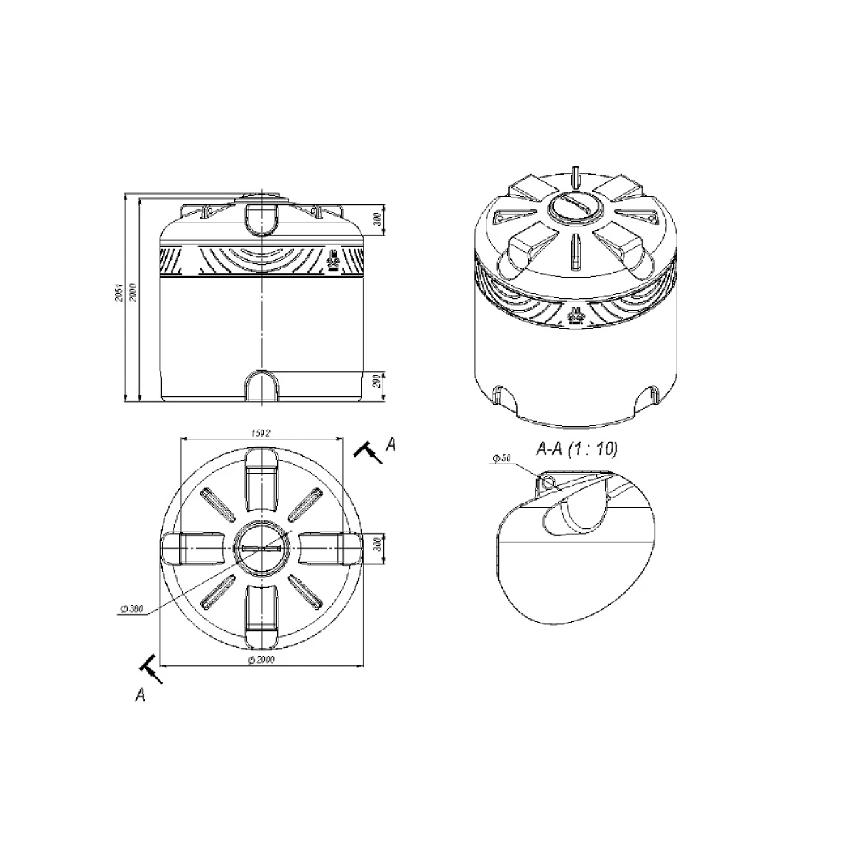 Диаметр горловины емкости составляет 400 мм, диаметр откидной крышки 457 мм.