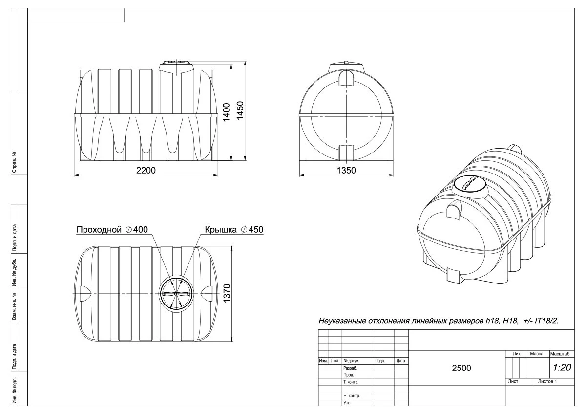 Горизонтальная цилиндрическая емкость G 2500 предназначена для хранения питьевой и технической воды, дизельного топлива.
