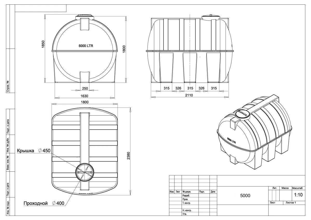 Горизонтальная цилиндрическая бочка G 5000 предназначена для хранения питьевой и технической воды, дизельного топлива.