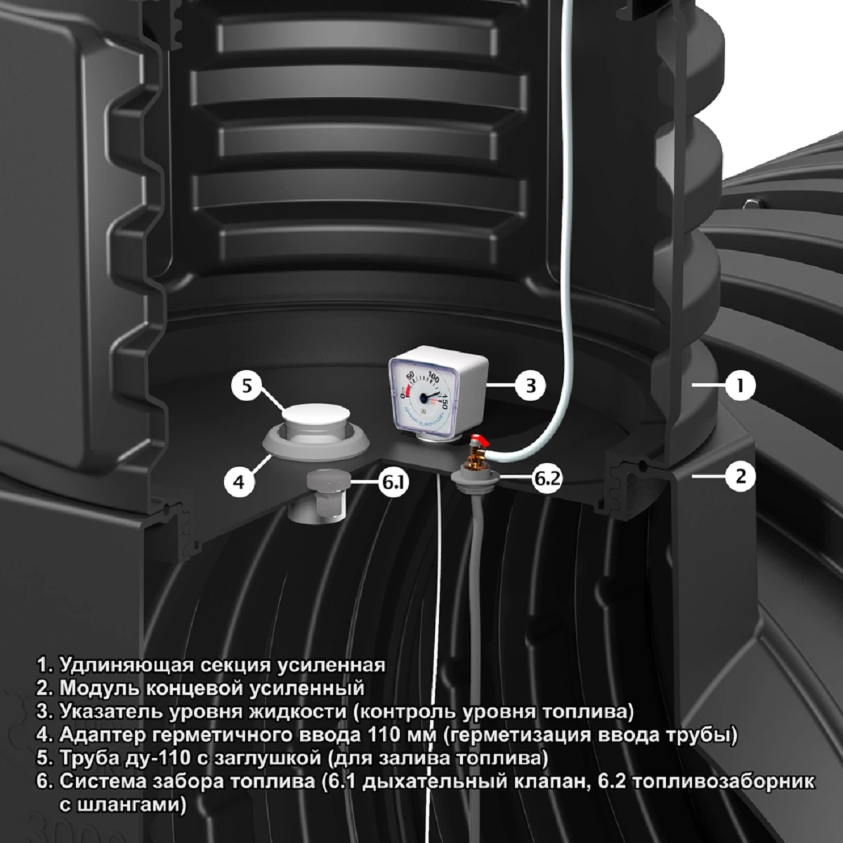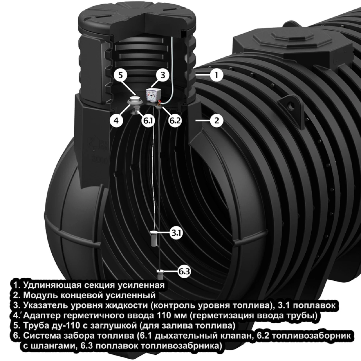 Главный элемент продукта - модуль объемом 3000 л. Концевой модуль оснащается доборными горловинами на винтовом соединении с диаметром 800 мм с крышкой. Он обеспечивает доступ для спуска и ТО. Предусмотрена возможность установки нескольких горловин, что позволяет увеличить глубину размещения всей конструкции (высота горловины 500 мм).