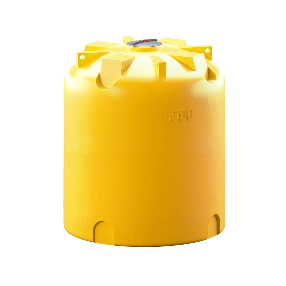 Вертикальная цилиндрическая усиленная пластиковая емкость объемом 6000 литров предназначена для стационарного хранения питьевой воды, пищевых продуктов, жидких удобрений, в т.ч. КАС., нефтепродуктов и химических веществ по согласованию плотностью до 1,5 г/см3. Также емкость может устанавливаться в транспортные кассеты.