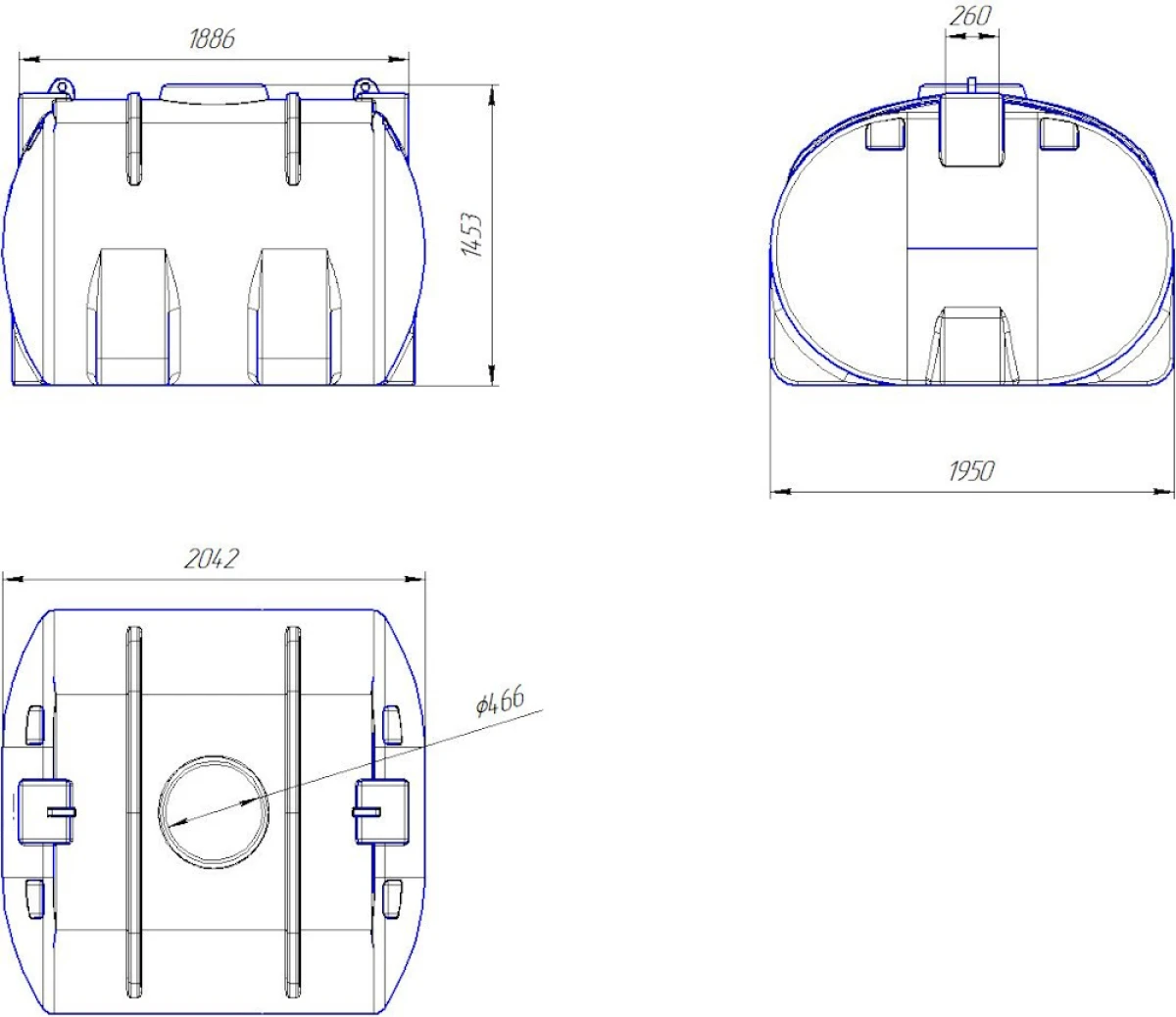 Горизонтальная усиленная емкость спроектированная нашими конструкторами таким образом, что при транспортировке в ней различных веществ она не деформируется и не лопается. Для установки в кузов или прицеп автотранспортного средства не требуется никаких дополнительных металлических обрешеток, нужно только надежно ее закрепить стяжными ремнями.