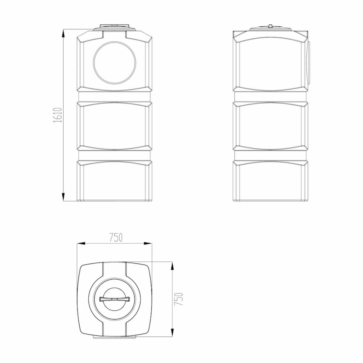 Вертикальная прямоугольная пластиковая емкость объемом 750л предназначена для стационарного хранения питьевой воды, пищевых продуктов, нефтепродуктов и химических веществ.