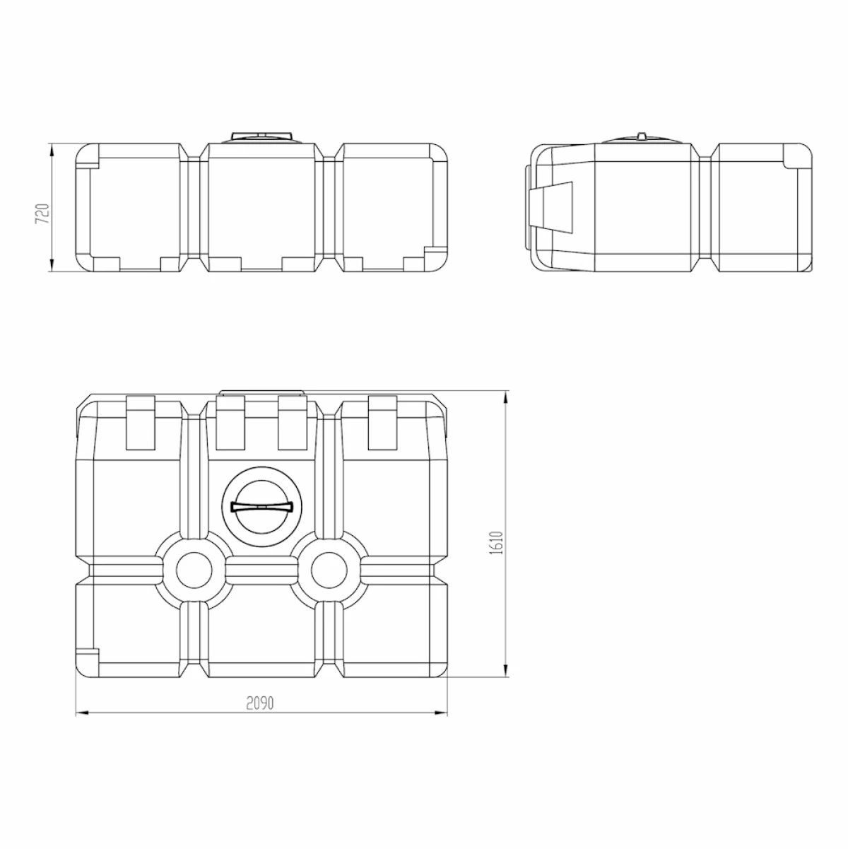 Прямоугольная горизонтальная пластиковая емкость объемом 2000л предназначена для стационарного хранения питьевой воды, пищевых продуктов, нефтепродуктов и химических веществ.