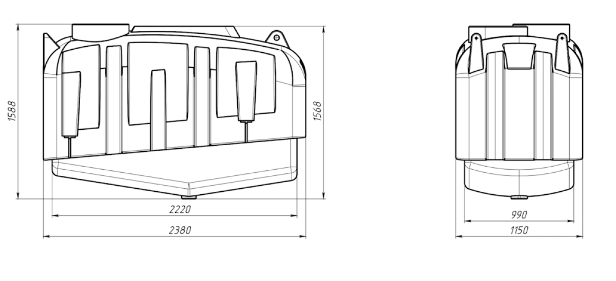 Данная емкость монтируется на наклонную раму «Т-образными» болтами, а боковые стенки емкости должны опираться на вертикальные стойки для исключения деформаций (раздутия) при заполнении.
