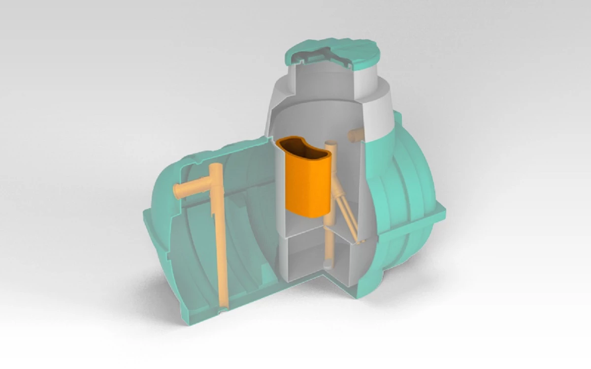 Насосный отсек предназначен для установки насосного оборудования непосредственно в септик, что позволяет в итоге отказаться от отдельных канализационных насосных станций (колодцев), либо других сооружений, необходимых для напорного отведения стоков. Применение септика с насосным отсеком существенно снижает затраты на оборудование, а так же стоимость монтажных работ из-за отсутствия необходимости покупки и установки дополнительных сооружений.