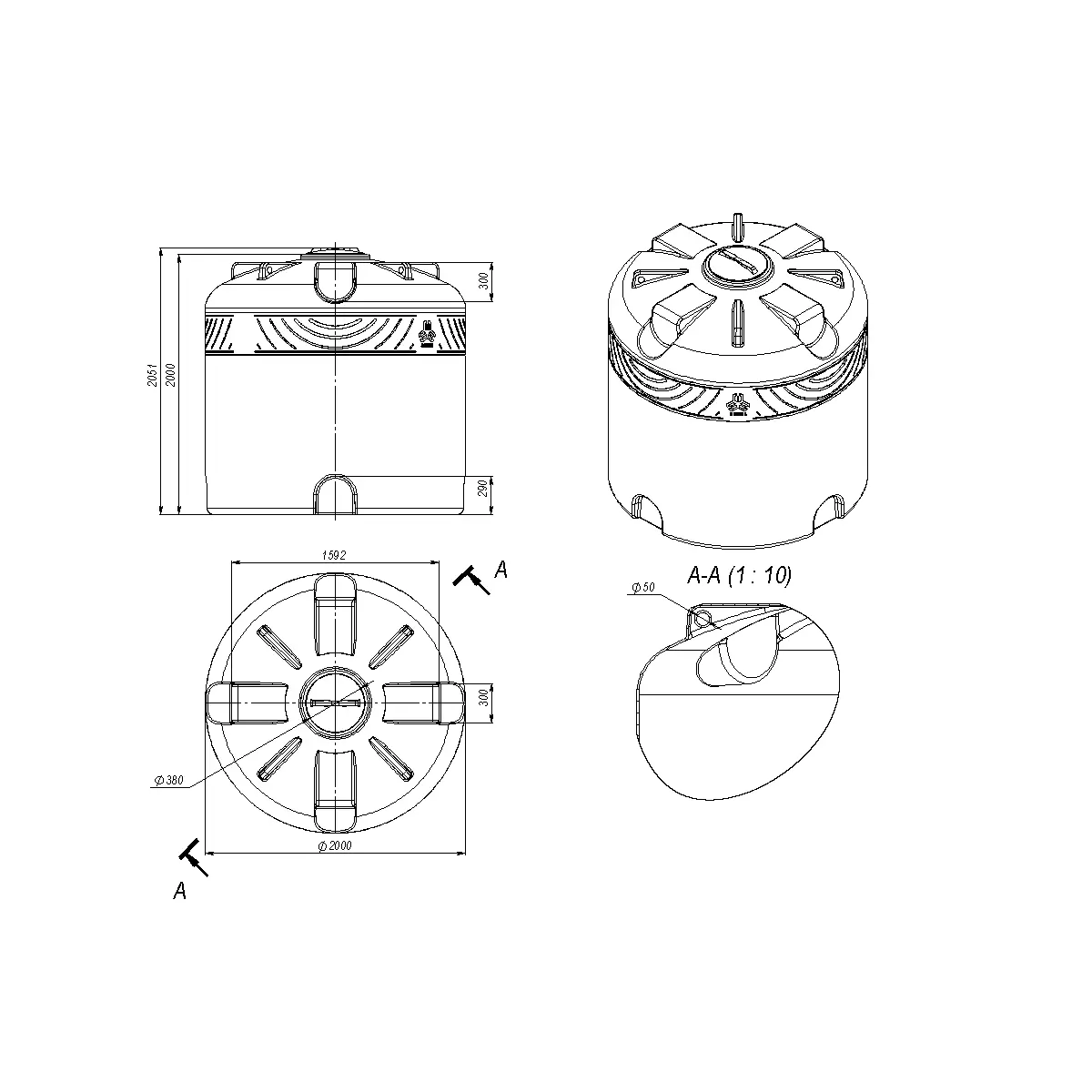 Диаметр горловины емкости составляет 400 мм, диаметр откидной крышки 457 мм.