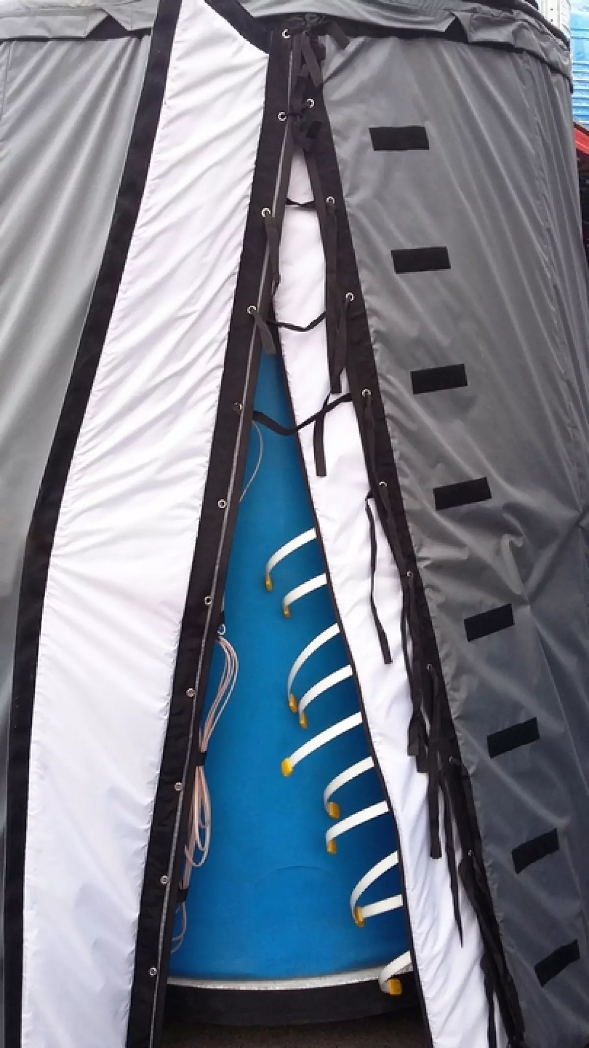 Материал чехла – ПВХ - непромокаемый прочный материал, который обеспечивает защиту от осадков, ветра и низких температур, в нему не прилипает бетон. ПВХ сохраняет эластичность при отрицательных температурах, он также устойчив к ультрафиолетовому излучению и гниению. В качестве обогрева используется резистивный кабель, который обеспечивает хороший тепловой контакт с емкостью, обладает эластичностью, что позволяет принимать необходимую форму при изменении диаметра емкости при наполнении её водой.