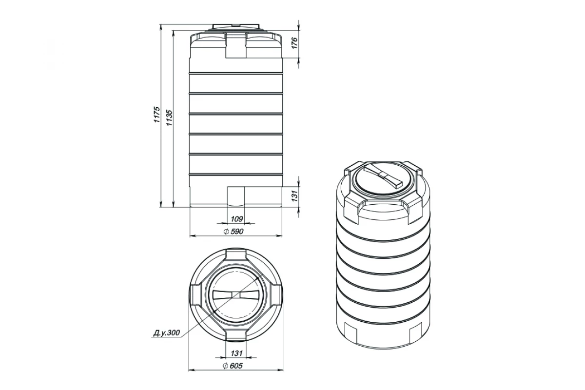 Вертикальная цилиндрическая бочка объемом 300 литров имеет максимально устойчивую конструкцию и усилена специальными горизонтальными ребрами жесткости.